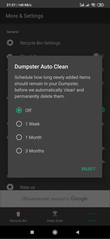 Choose how long you would like Dumpster to save your deleted files for, before permanently deleting them from your device: