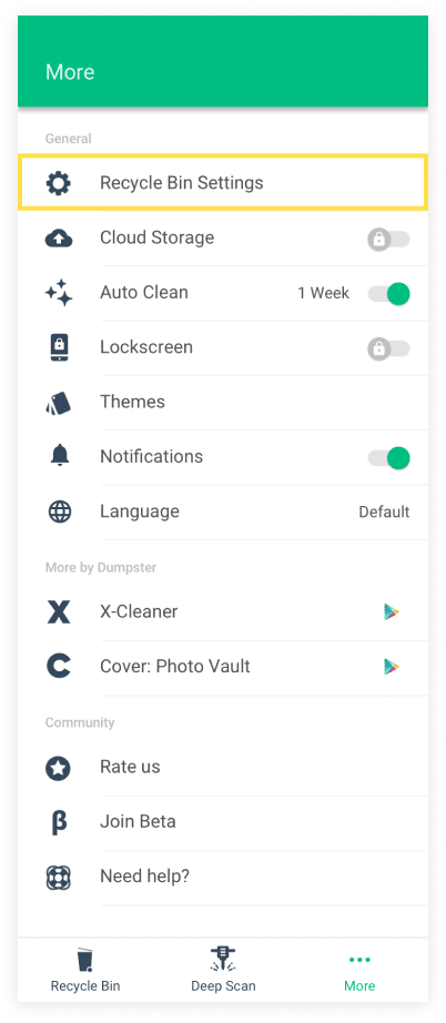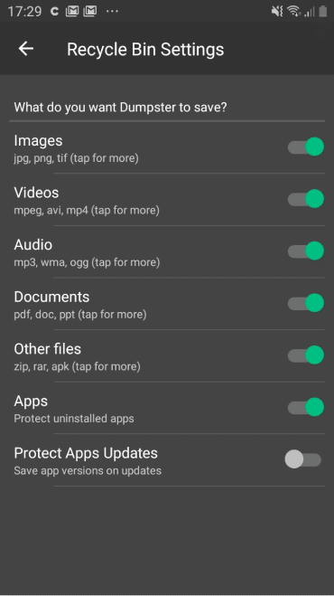 To do so, tap on the “More” tab located at the bottom right-hand corner of the screen. Then, tap “Recycle Bin Settings” at the top of the screen. Here you can easily choose which file types you would like Dumpster to save.