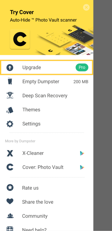 You can free up valuable storage space on your device by upgrading to a premium account. Premium user files will be saved to Dumpster’s secure virtual cloud, rather than stored on your device.